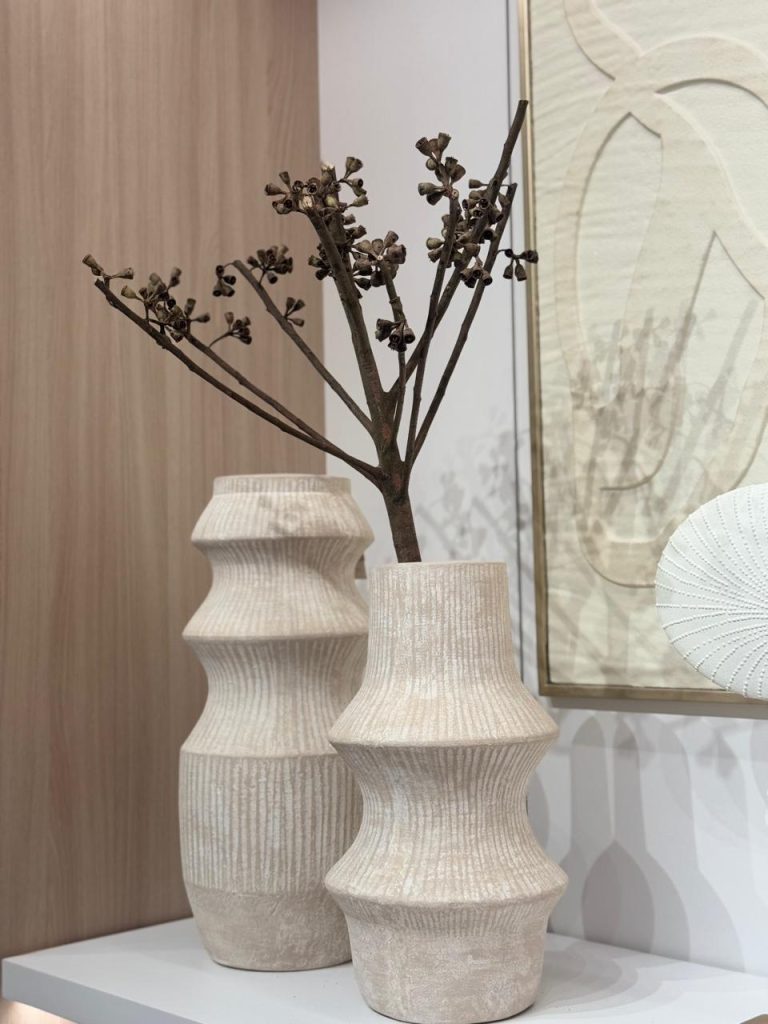 Camadas de volume e textura nos aparadores e estantes; ajudam a “ancorar” a parede quando combinados com quadros. (É um dos focos da loja.) D´Presentes Lavras